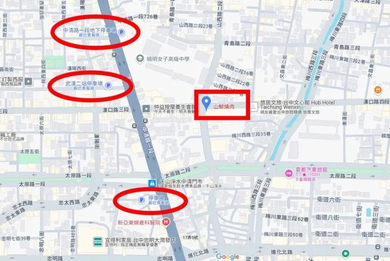 山鯨燒肉漢口店位在漢口路與山西路交叉口,附近規劃了不少機車格可以找找,開車的朋友在山鯨燒肉漢口店正後方停車場消費一套餐給予$100元停車折抵,另外中清路上也有收費停車場,步行約10分鐘左右可抵達。