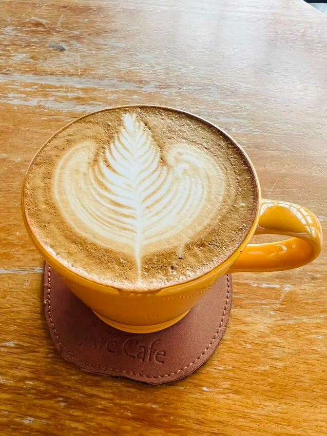 過了前面這一座橋直走,不遠就會看到大團圓餐廳,走向大團圓的左邊再步行過一座竹芳橋,走大約3至5分鐘,Arc咖啡廳就在右側邊