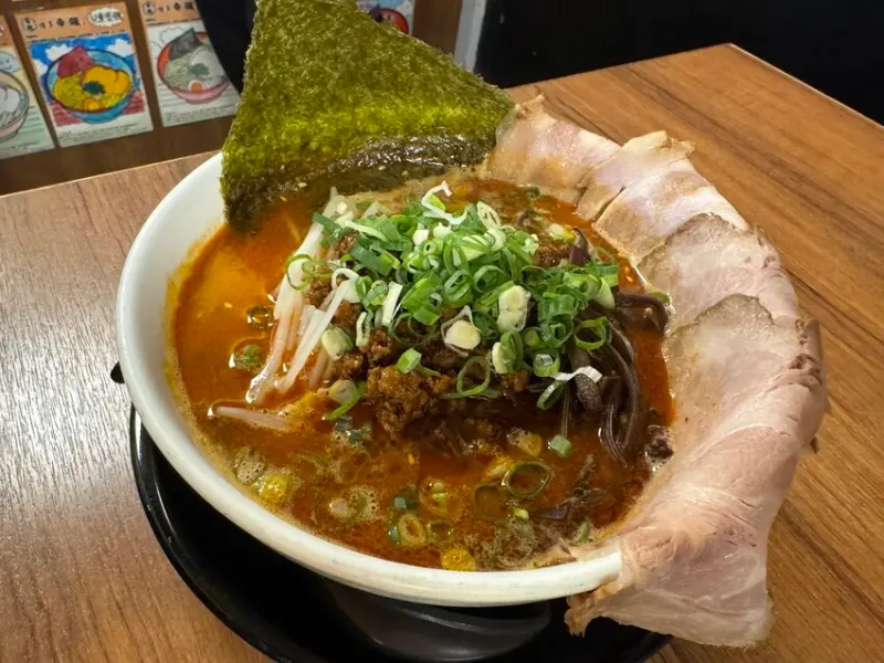 蔥花底下淋上肉燥,叉燒肉麵掛在拉麵碗上,這個辣是會讓你頭皮冒汗的,不知道激辣口味是如何?