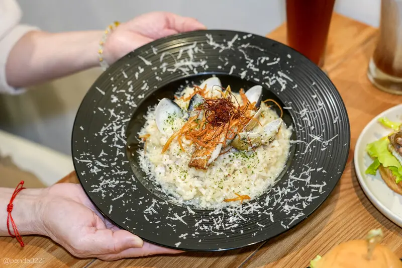 七股虱目魚蛤蜊燉飯結合義式燉飯與台灣在地食材,煎脆的虱目魚搭配薑絲、蒜片和蛤蜊,味道濃郁卻不膩。燉飯保有米心口感,還有切丁的虱目魚,每口都能品嚐到鮮美的魚肉。