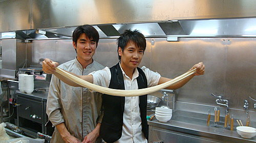 首先要利用食指,中指和無名指,抓住麵條兩端,上下甩動將麵條拉長,對折後重覆步驟,不出十五秒時間,薄如紙片的手工寬麵條完成囉,不過這看似簡單的步驟,換成一般人來體驗,可不是人人都能上手。