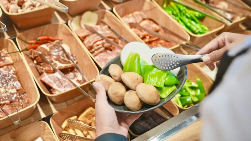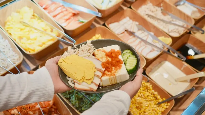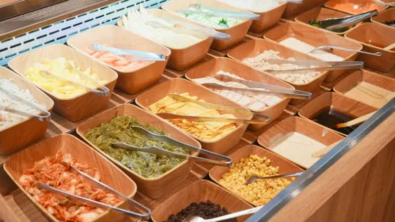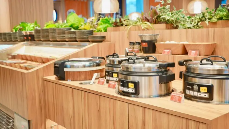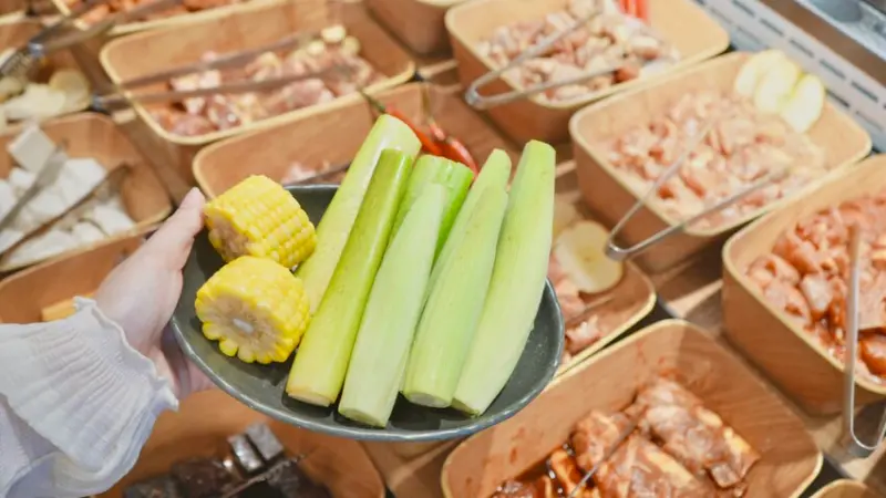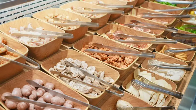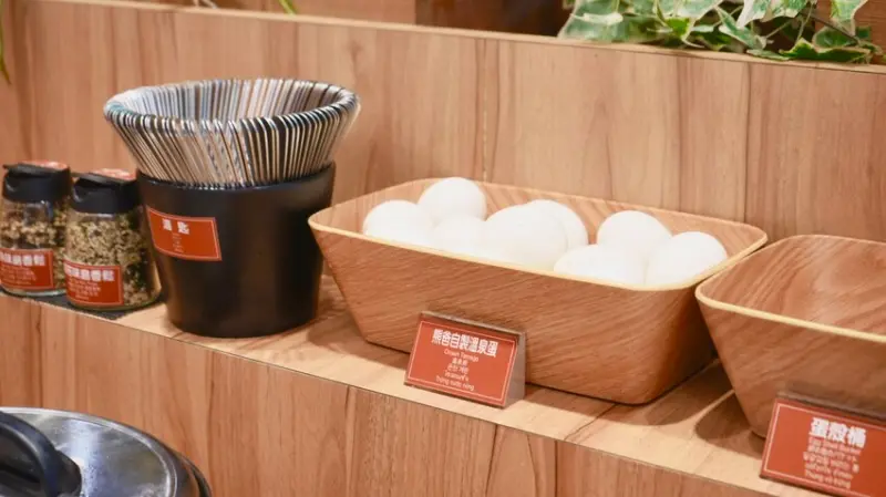 生菜吧、野菜吧有各式各樣的冷盤食材,非常適合解膩轉換口味,像是泡菜、百香果青木瓜,沙拉吧竟然有玉子燒、蟹肉棒吃到飽,旁邊還有好吃的「熊爸溫泉蛋烏龍麵」,都是我超愛的食材呀!