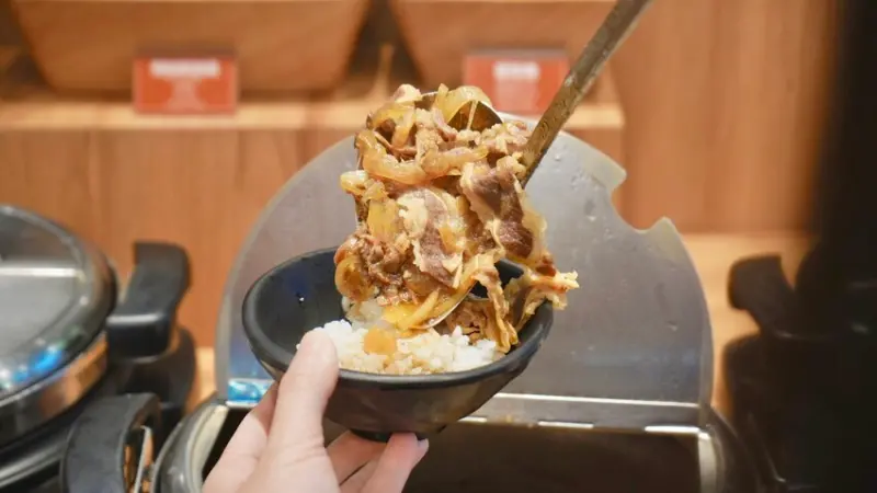 飯吧千萬別錯過,這裡有好好吃的滷肉飯、壽喜燒牛丼、安格斯牛黑咖哩,那咖哩真的超級濃郁,讓我忍不住一口接著一口,完全停不下來的美味,重點是旁邊還有溫泉蛋吃到飽,可以搭配咖哩、烏龍麵、壽喜燒牛丼一起享用,非常日式口味唷!