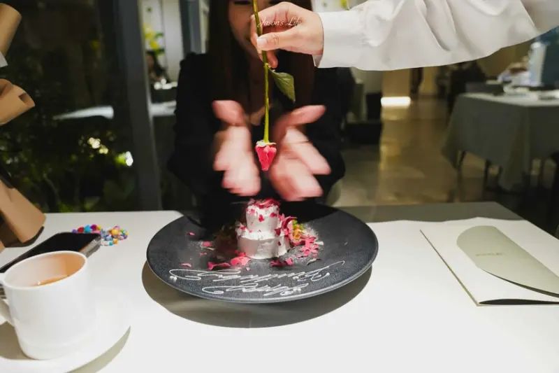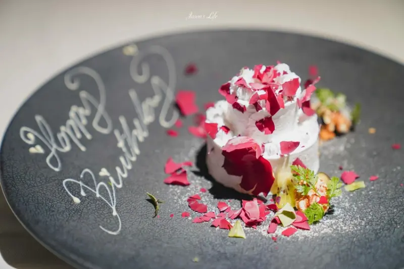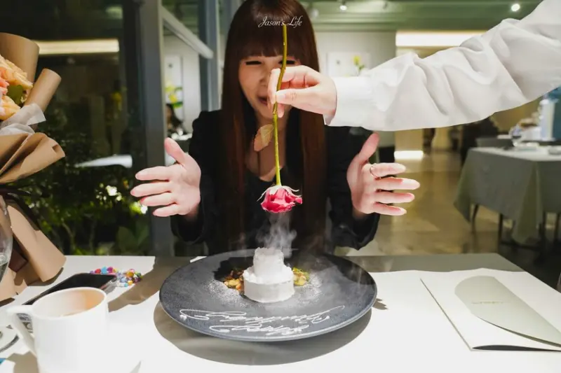 在預訂時,只需提前註明是慶祝或慶生場合,並表明要預訂液態氮玫瑰花(+399元)。這份驚喜從一個看似普通的奶油蛋糕開始,隨後服務人員會從液態氮中取出一朵玫瑰花,令人眼前一亮。