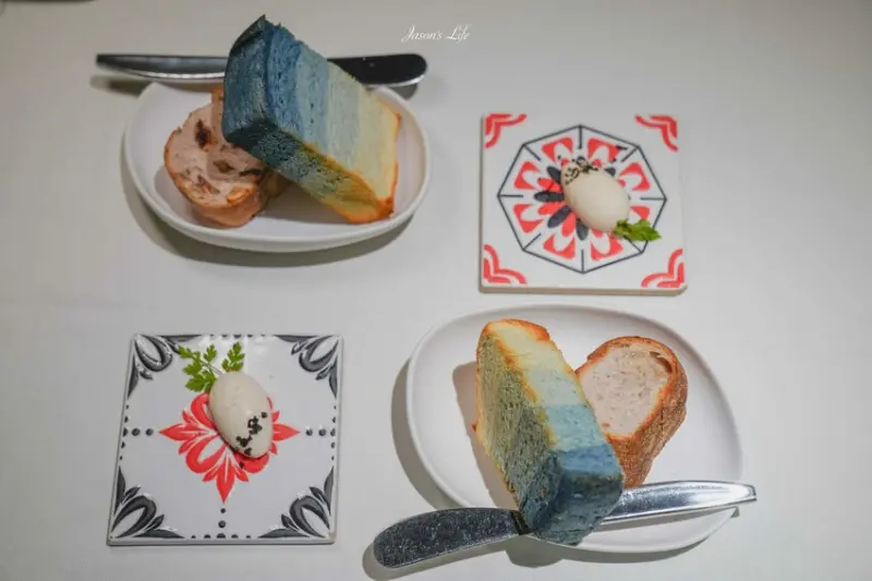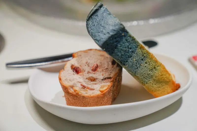 藍染吐司和核桃麵包的創意令人驚豔。核桃麵包中混合櫻桃,而藍染吐司則因添加青黛粉展現如彩虹般的漸層效果,帶有微微蒜香,口感酥脆。一旁附上的鯷魚奶油醬可依個人口味搭配享用。