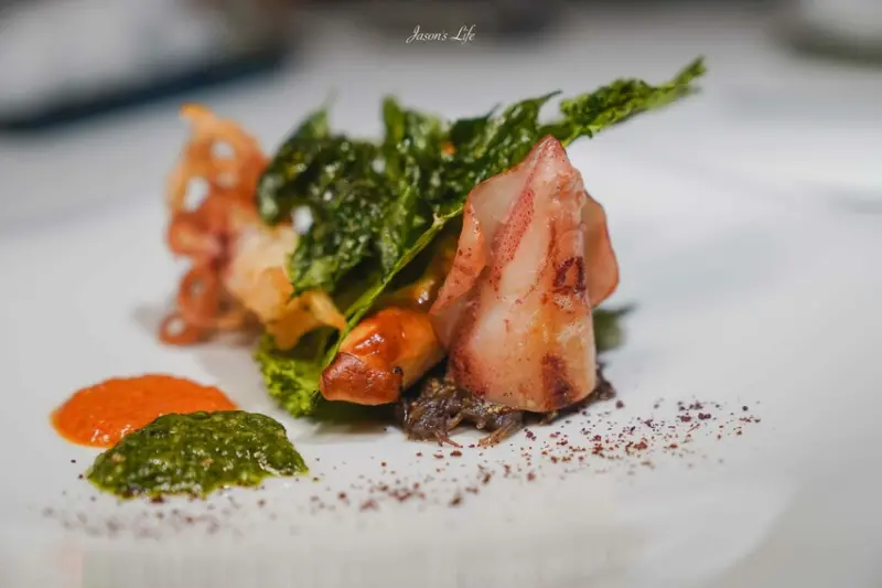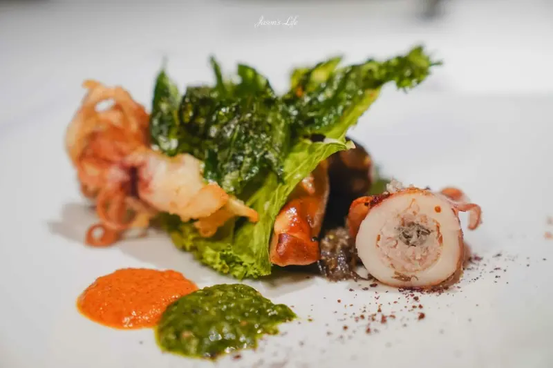 綠色的蘿勒醬與橘色的甜椒醬,為小卷增添豐富風味,而深色粉末的鹽膚木則帶有微酸的清新感。澎湖小卷內塞入豬絞肉,Q彈的口感伴隨香氣釋放,搭配不同醬料品嚐,層次多變。