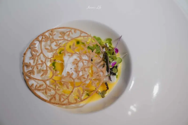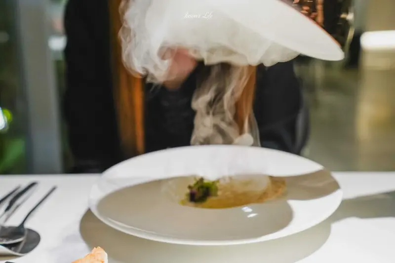 服務人員揭開蓋子時,胡桃木的煙燻香撲鼻而來。煙燻圓鱈帶有淡淡的煙燻味,底層鋪著焦化奶油醬,點綴茴香醬的清新綠色,搭配餅乾延展口感,彷彿一件藝術品。