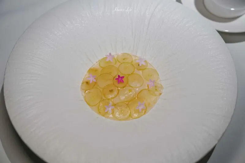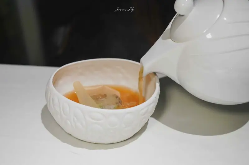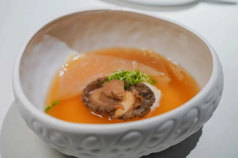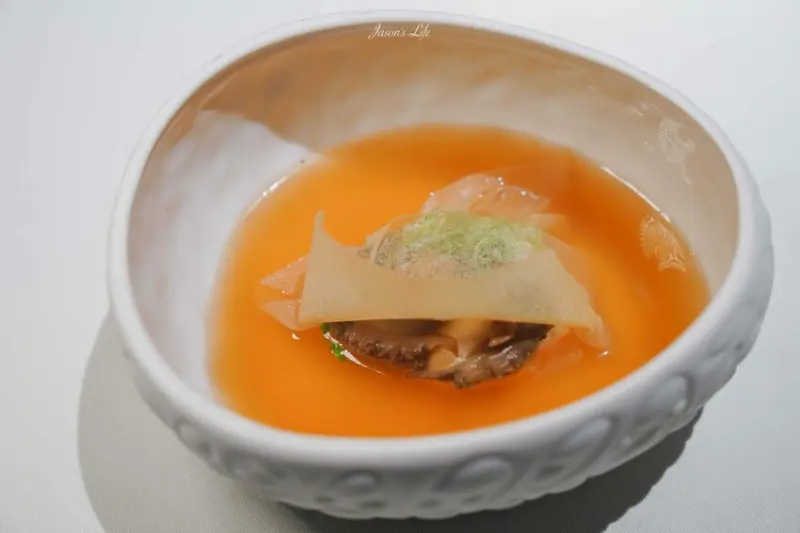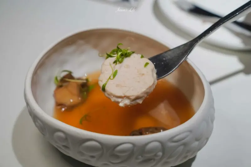 法式清湯內有舒肥雞胸肉與鮑魚,搭配清爽的雞湯呈現。湯品表面覆蓋的薄膜為豆腐製成的千張,層層口感細膩。鮑魚Q彈,湯品清爽,令人回味無窮。