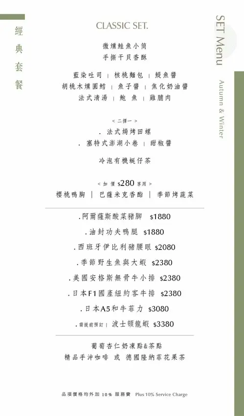 餐廳的菜單分為「經典套餐」與「法月套餐」兩種,主要差異在於沙拉、鴨胸和烤田螺的選擇,讓顧客可以依喜好挑選。