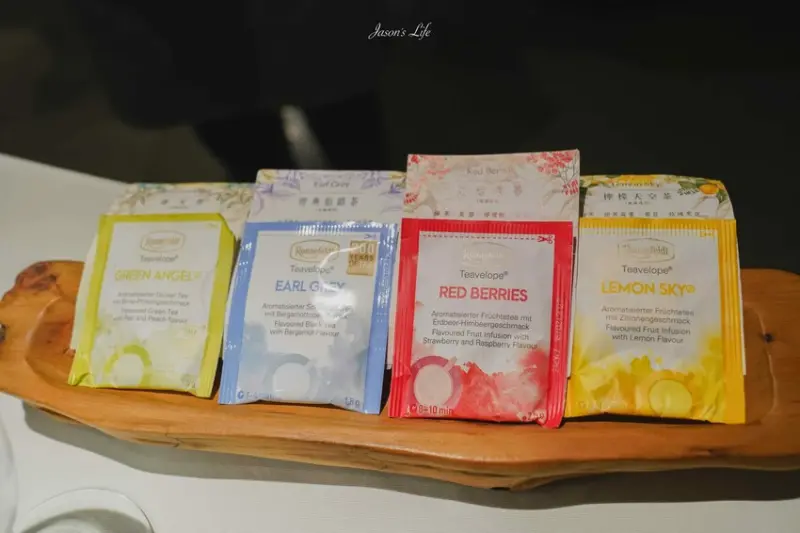 德國隆納菲花果茶提供四種風味選擇,服務人員會細心介紹,讓顧客依喜好挑選。