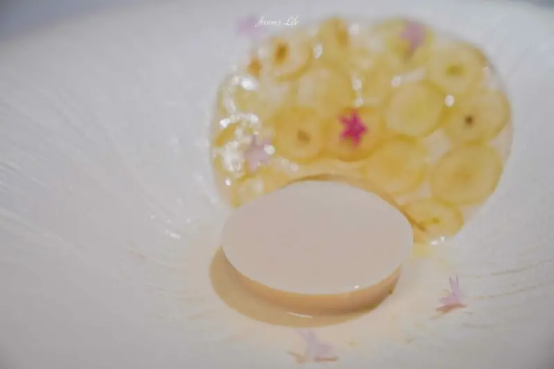 上層由新鮮白葡萄製成果凍,切片工藝細緻,每片都清晰可見。冰鎮後的果凍入口冰涼,帶來清新愉悅的感受。