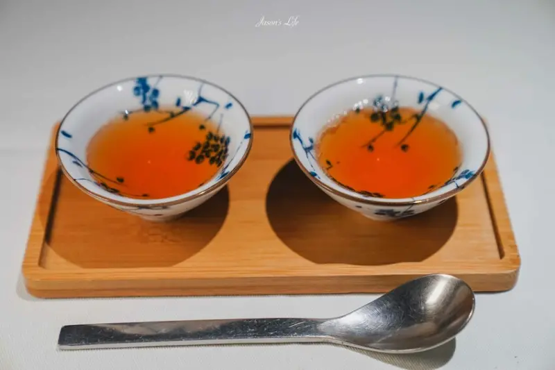冷泡有機蜒仔茶在前菜後登場,剛好用清爽的茶香平衡前面烤田螺或小卷的濃郁口感,重整味蕾。