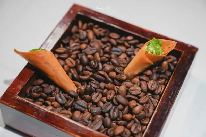 微醺鮭魚小筒的餅皮煎得酥脆,內餡包裹著鮭魚與用蝦夷蔥調製的醬汁,入口風味豐富。