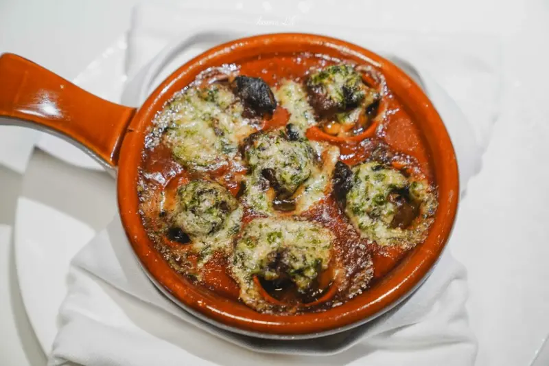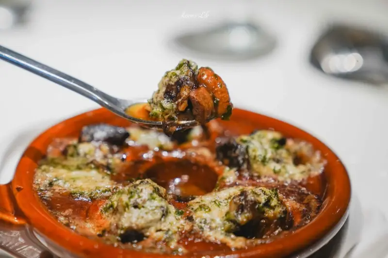 經典套餐特別提供烤田螺與澎湖小卷兩種選擇,與法月套餐不同。法式焗烤田螺以田螺、蘑菇和奶油羅勒醬焗烤而成,香氣濃郁,令人難忘。