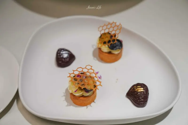 以栗子塔為主角,搭配白色巧克力和新鮮藍莓,甜點旁還有一顆造型如栗子的海鹽巧克力,口感與視覺兼具。