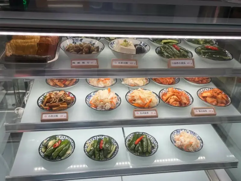 瞄到旁邊的小菜櫃,裡面的台式泡菜看起來超吸引人,忍不住點了一盤來試試。