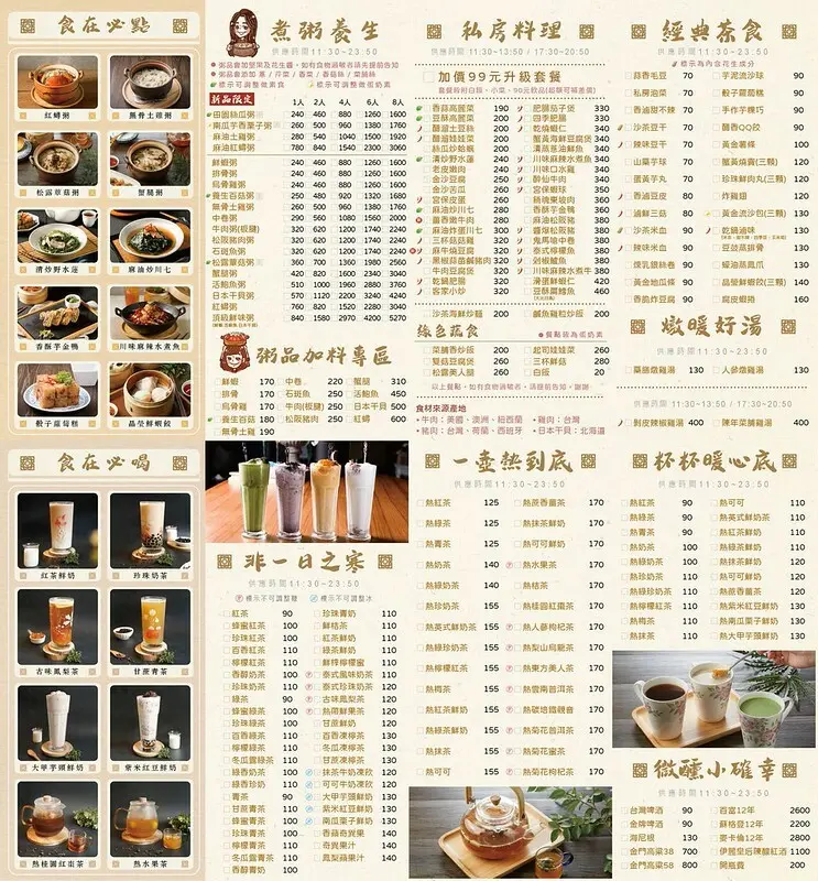 There are 19 types of porridge (vegetarian and meat), with portion sizes ranging from 1 to 8 people. In addition to tea drinks and refreshments, there are also various hot-fried dishes.