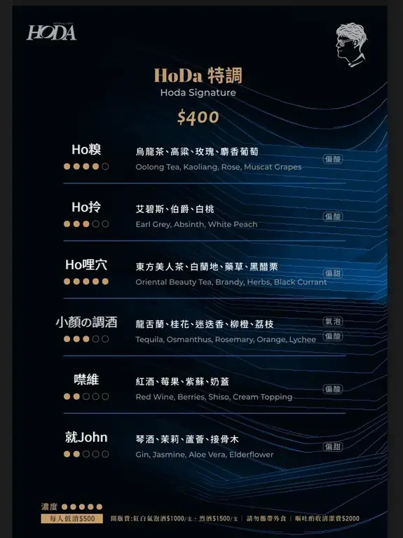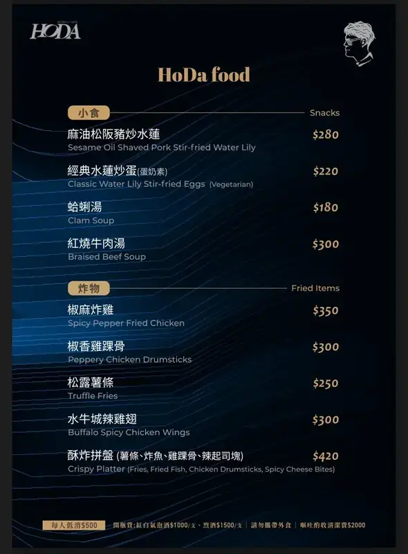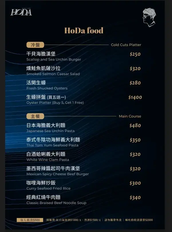 Hoda Bistro餐酒館提供冷盤、主餐、小食、炸物…等餐酒料理,還有多款特調飲品、酒水…等可搭配餐點。