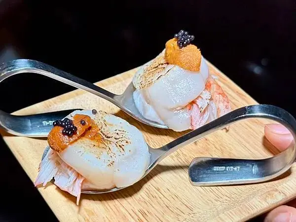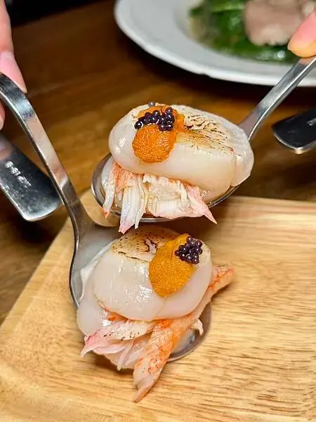 這款霸氣的奢華料理,是將新鮮日本生食級干貝、蟹肉棒、濃郁海膽與魚子醬一同夾在蓬鬆麵包中,一口咬下,滿滿的海味鮮甜衝擊味蕾,彷彿置身海洋!