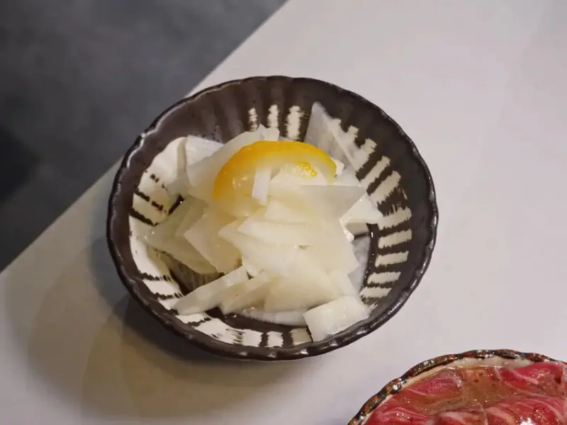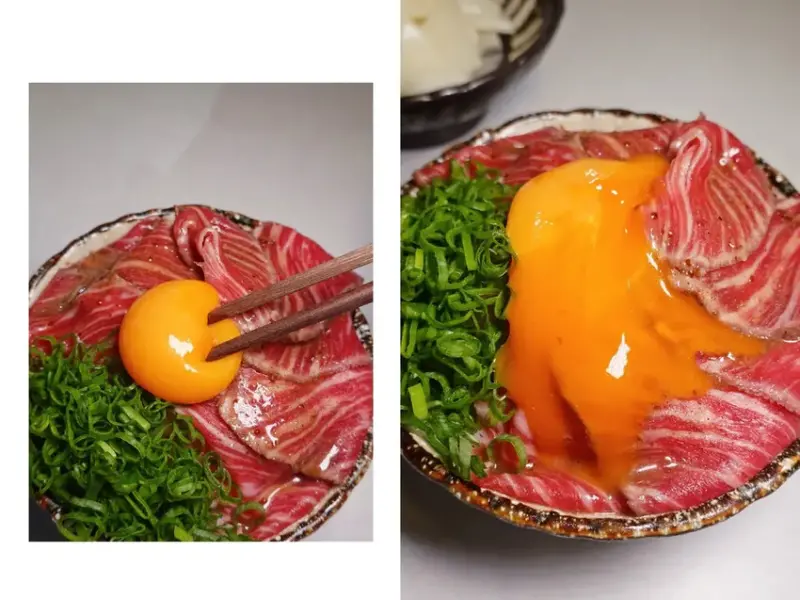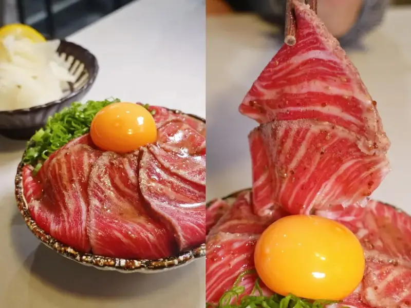 這道生牛肉丼可是講究至極!選用美國Prime等級翼板肉,加上臺灣放牧蛋,油花分布均勻,蛋黃飽滿,生食無負擔。肉香和蛋黃的滑順交織在一起,調味剛剛好,是一道高質感的前菜。