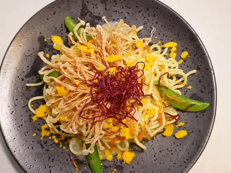 這是一道創意滿分的臺日融合料理!用油麵搭配自製金沙醬,鹹中帶甜的層次口感讓人驚喜,炸金針菇和地瓜絲的點綴更添豐富感。