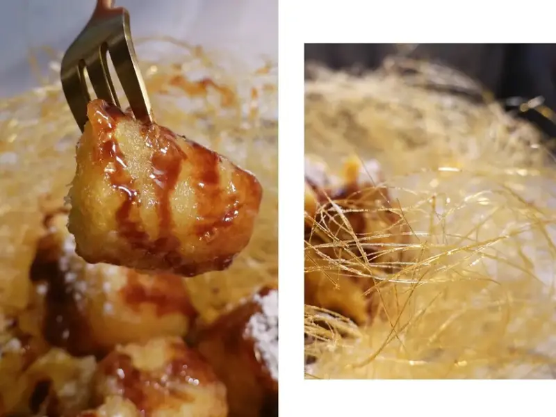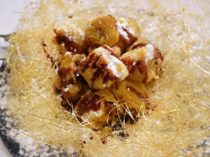 選用帶有酸度的香蕉,經油炸後,淋上糖粉與苦甜巧克力醬,外皮酥脆、內裡軟嫩,單吃就有濃濃的東南亞風味。而如果搭配焦糖拔絲一起品嘗,還能感受到那一層帶焦香的絕妙口感,讓整道甜點層次更加豐富。