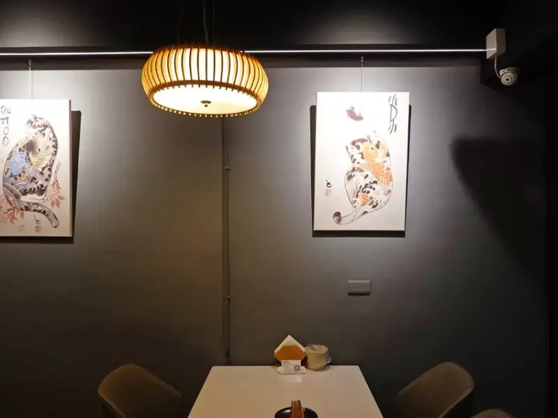 店內有兩層樓,一樓是吧台加桌型座位,冷色系的裝潢搭配暖光燈,牆上掛著可愛的貓咪畫作,給人一種鐵漢柔情的視覺衝突感。