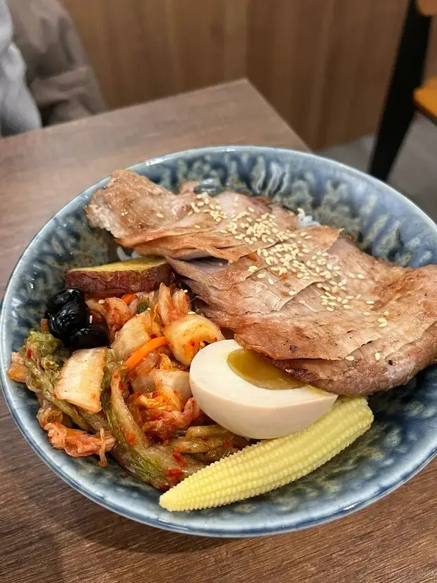 一整排牛肉鋪滿丼飯,光看就讓人流口水!牛排熟度剛剛好,吃起來柔軟又好咬,搭配香酥的蒜片,每一口都充滿濃濃的香氣。