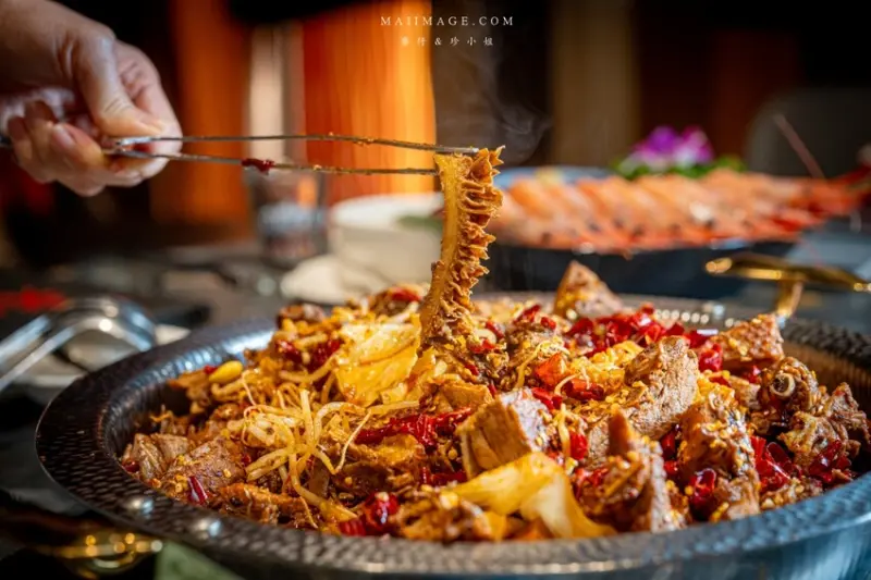 這次最期待的就是香鍋鴨了!它既是一道料理,也能加湯變成火鍋,真的超划算。鍋裡放了一整隻茶鴨,加上滿滿的辣椒和香辣醬,香氣十足。鴨肉軟嫩又入味,鴨胸滑嫩不柴,鴨皮還帶著淡淡茶香。