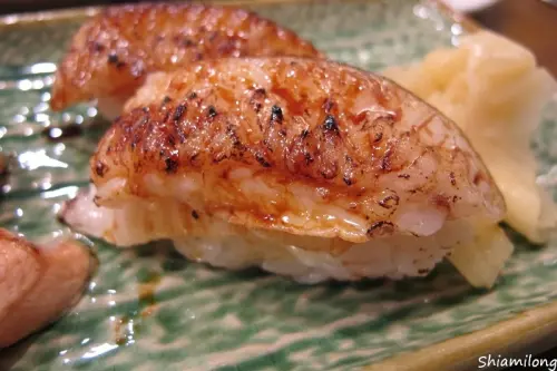 而且上頭放上好幾片比目魚鰭邊,經過炙燒過後比目魚鰭邊的油脂被逼了出來