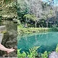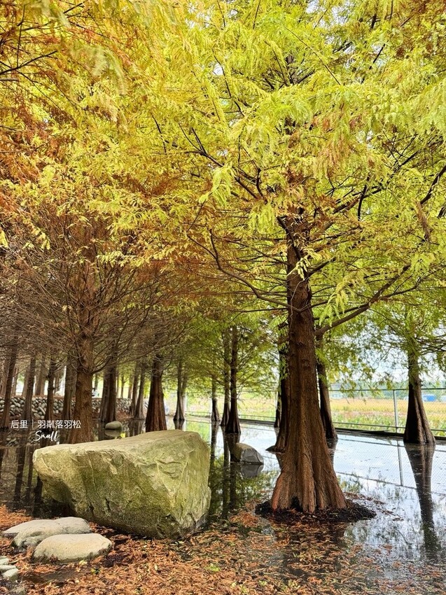 兩側的落羽松樹林雖然只有轉色一半,但是幽幽蒼蒼的樹林下有鋪設石頭步道,穿梭在水池當中,落下的紅色針葉在水面上沉浮,美麗的秘境已經讓人徘迴不已,另外還貼心設置了木椅和巨石供民眾取景拍照,很好拍捏,而且不用排隊很久~超開心