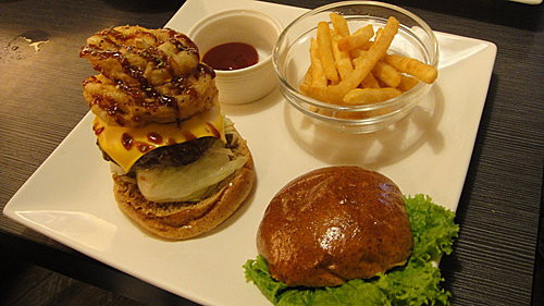 將酥脆的洋蔥圈層層堆疊在漢堡肉,兩種不同的口感同時入口咬下,