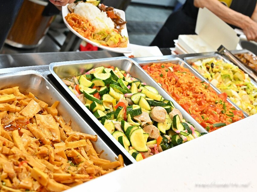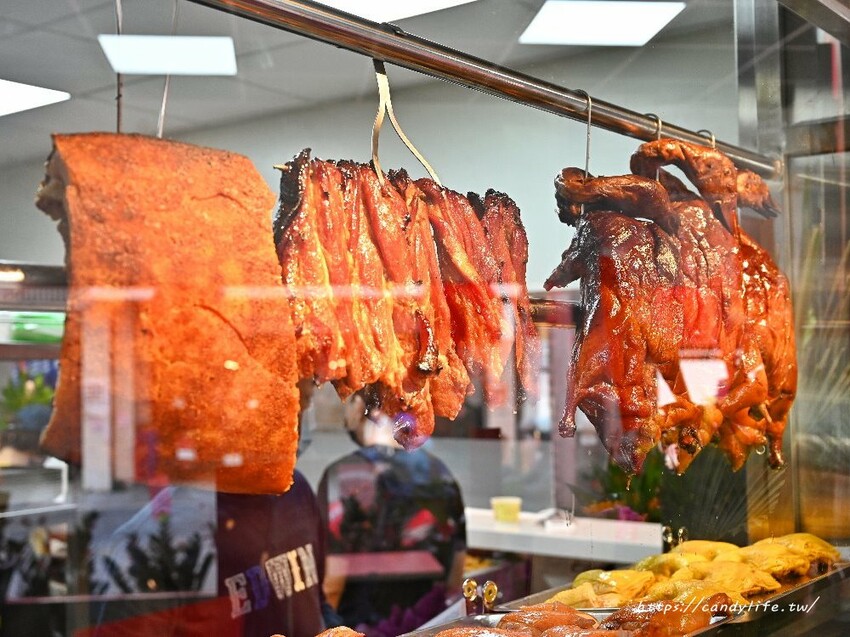 吉仕貳館的餐點都是當天新鮮製作,瞧瞧櫥窗上掛滿了燒臘的模樣,看起來是不是讓人食指大動呀,配菜也很豐富,每個便當除了主餐外基本上都會有四樣配菜