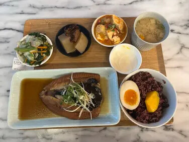 套餐裡面有三樣配菜:高麗菜菠菜、滷白蘿蔔、蕃茄豆腐、溏心蛋以及淹白蘿蔔