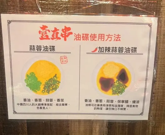 壹直串麻辣鴛鴦不用沾醬就很夠味,喜歡口感強烈一點的,參考店提供的沾醬配方,口感再升級!