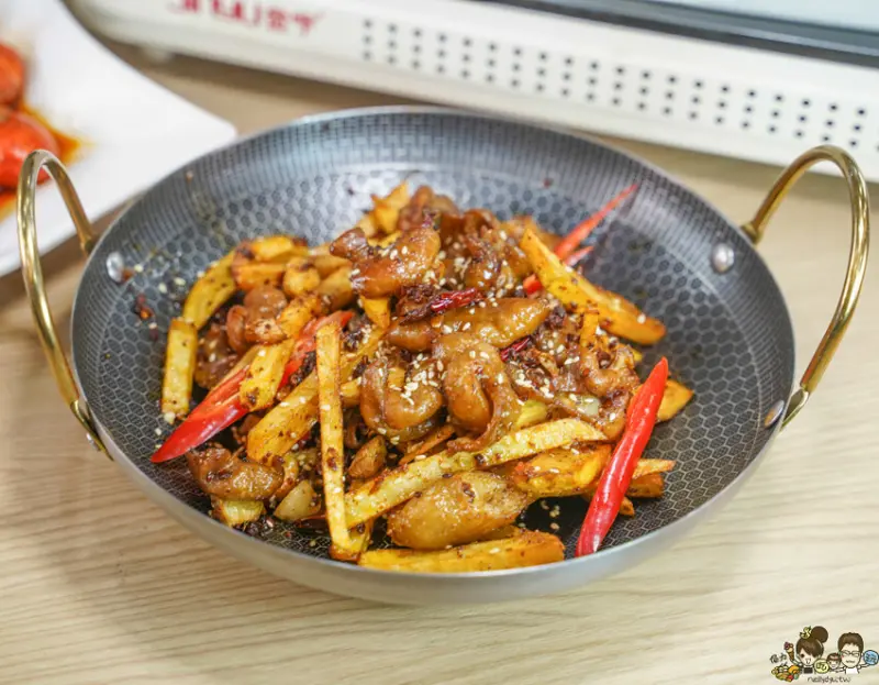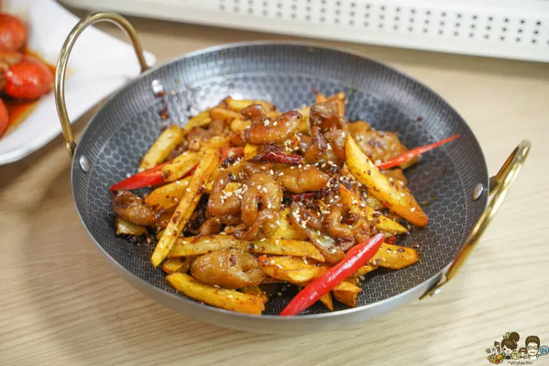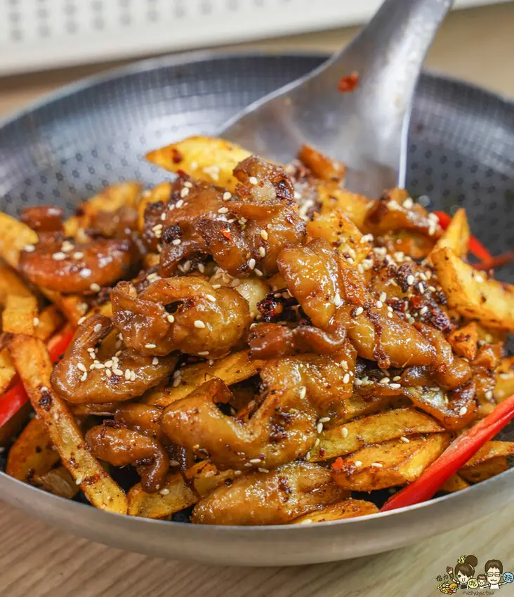 加入大量的油炸土豆,祕製乾鍋調味