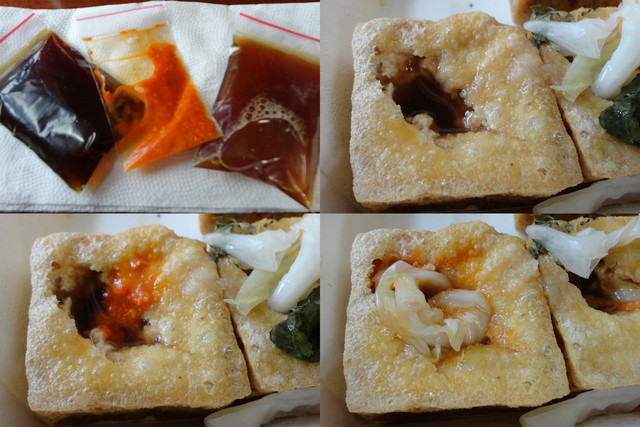 Vic 食用的方式就如同照片這樣...在豆腐孔上倒入蒜泥醬油,接著加入一些辣椒醬,然後再放入泡菜和九層塔,最後...毫不考慮,一口塞進去嘴裡,整個滋味融合在一起才對味啊~