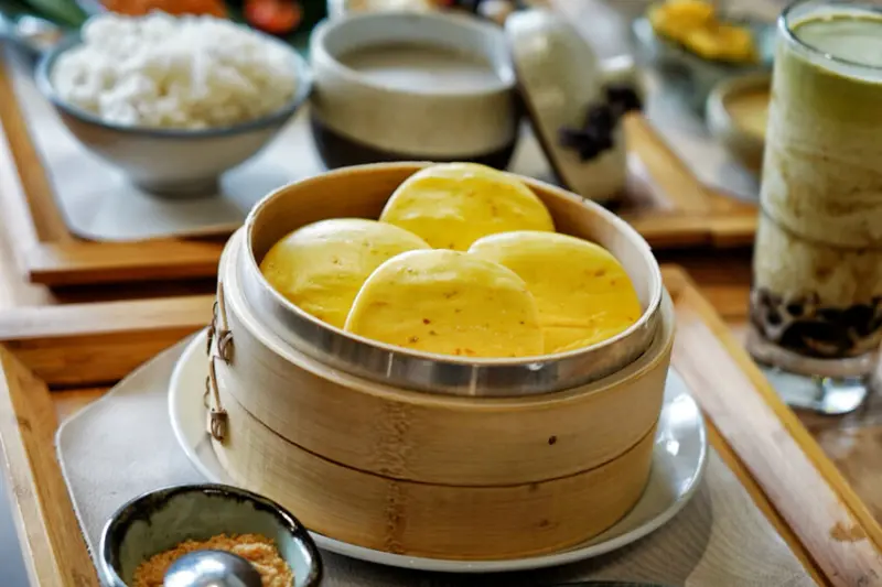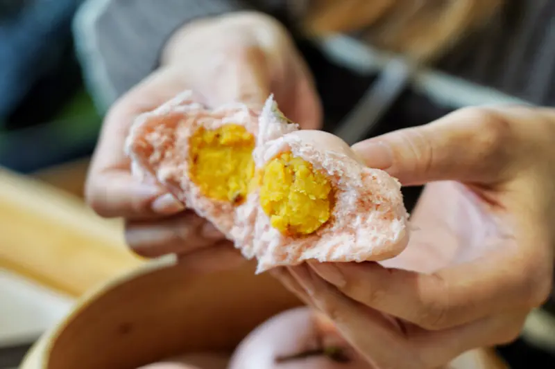 粉紅色櫻花包很可愛!上面有醃漬櫻花裝飾,軟綿包子皮加上奶香奶黃餡,吃起來也滿香~