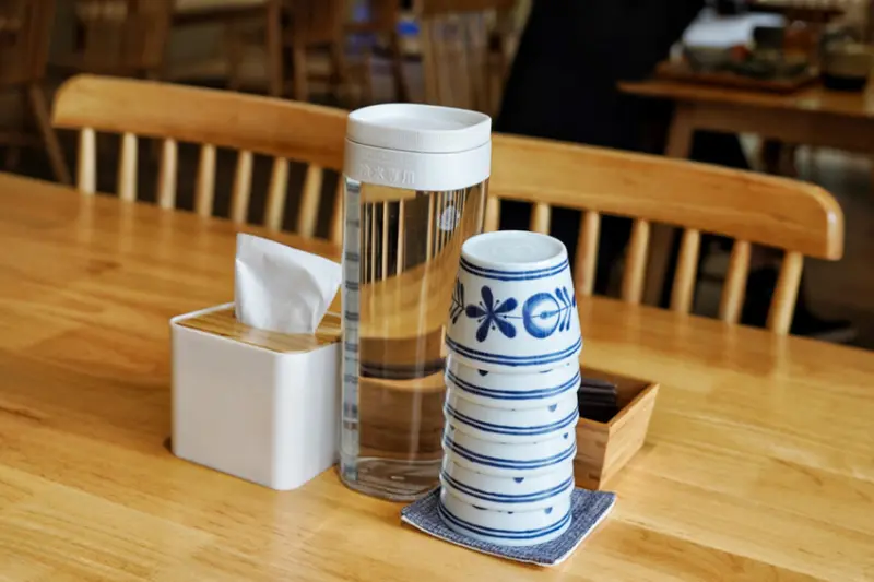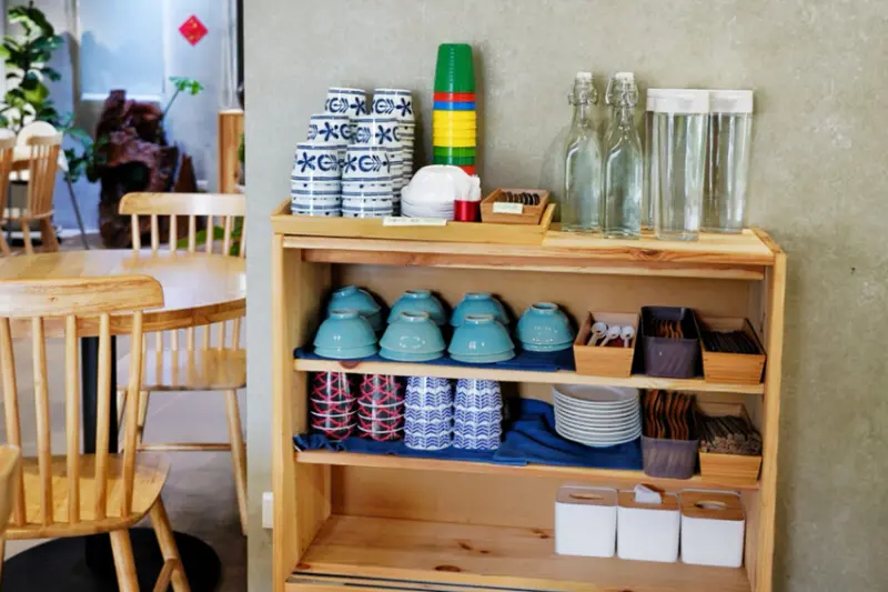 自助區有開水與餐具!碗筷盤擺放整齊,器皿餐具配色也好看~