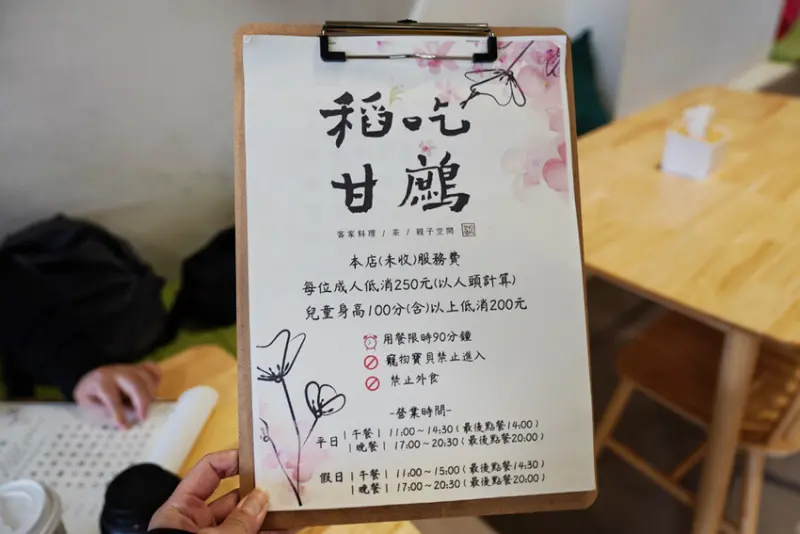 如果不是朋友帶路!真的不會知道這間稻吃甘鷓,以客家料理為主的親子友善餐廳,門口就有停車位,還有戶外草皮空間,店內不定時推出親子活動課程,很適合親子客,店內有好多道客家功夫菜,像是梅干扣肉、東坡肉都很讚,低消一個人250元、內用不收服務費~