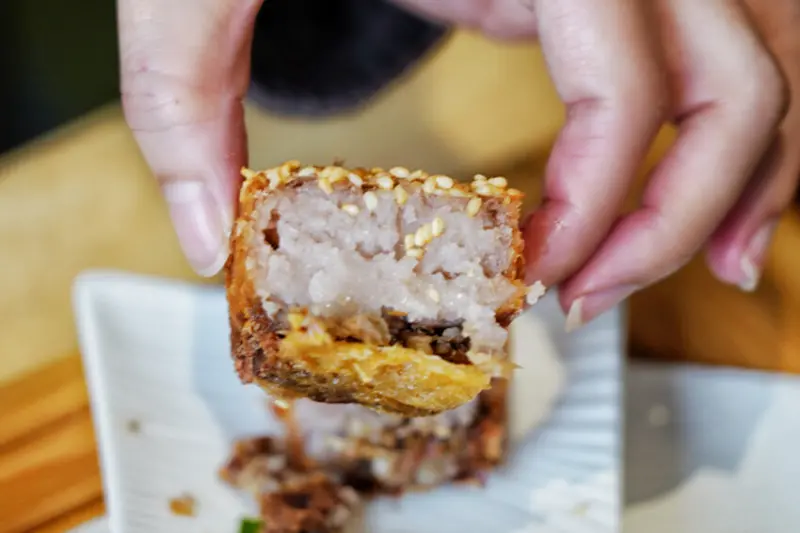 這道功夫菜很少見!底部鴨肉上面抹上一層超厚芋泥,上面還有一整層白芝麻,炸到金黃香酥肯定是好吃,先是超濃郁芝麻香,接著是芋頭自然香氣,結合酥脆、扎實與綿密三種口感,想要大口吃芋頭要點~
