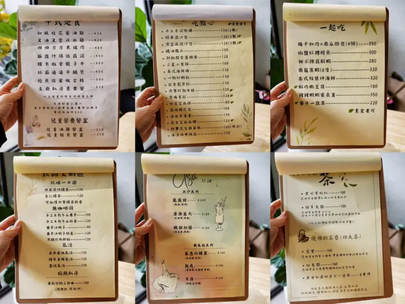 餐點以客家料理為主!有中式定食、中式點心、北埔擂茶、手工熬冬瓜、氣泡飲與功夫茶,共有8種中式定食,每套420元~500元之間,定食均附好茶乙杯,也能選購其它飲品折抵,點心類結合中式客家與港式點心,很多我都想吃~