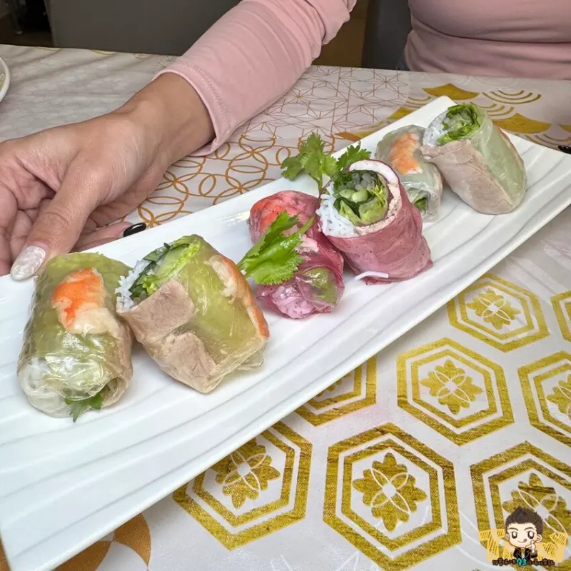 外皮使用糙米、火龍果、原味三種口味的米紙,包裹肉片、蝦子、生菜、米線等食材。