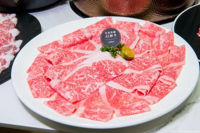 一樣吃肉要爽爽吃,這盤也是2倍肉量。宮崎有世界上知名的日本和牛,以日本原產的黑毛和牛血統,肉質是A5最高等級。肉邊的油脂比較高,中間帶著霜降般的油花,滑順、油脂香,口感不油膩。