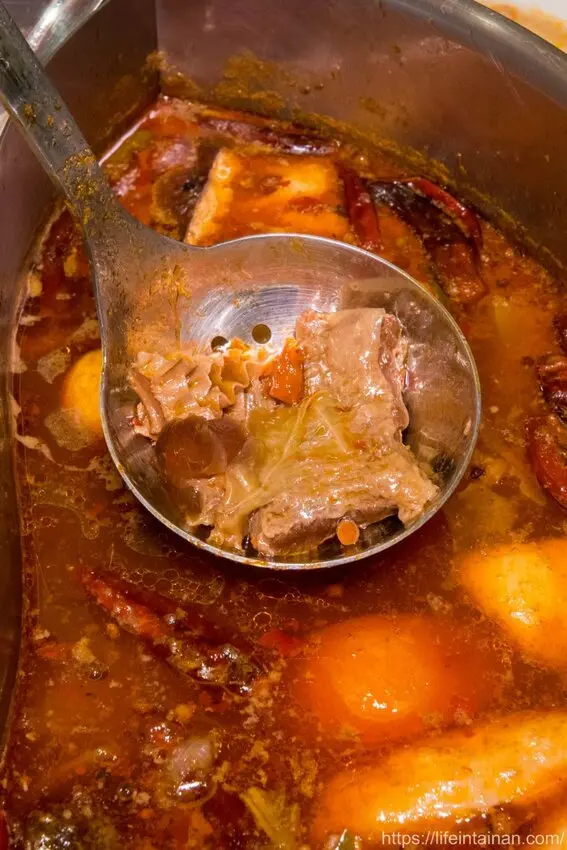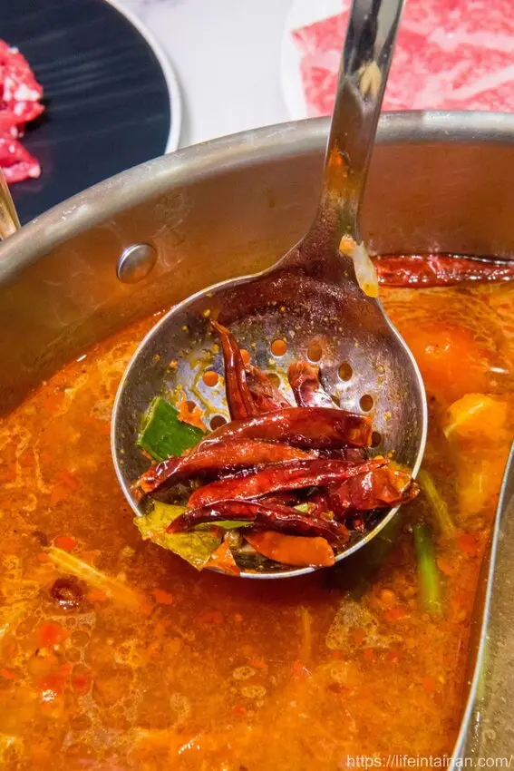 『川蜀麻辣鍋』以牛肉湯為基底湯,搭配牛油、花椒、中藥材,為小辣的程度,因為加了牛油味道更香,而不是單純的辣而已。