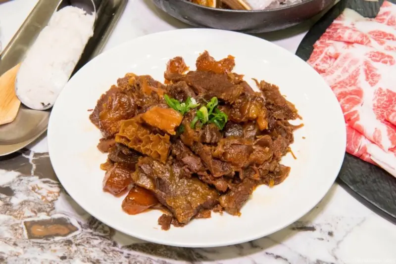 『滷三寶』牛肉、牛筋和毛肚,顏色滷的很深,帶點口感,可以直接吃,個人喜歡放到麻辣鍋再煮一下,味道更香。