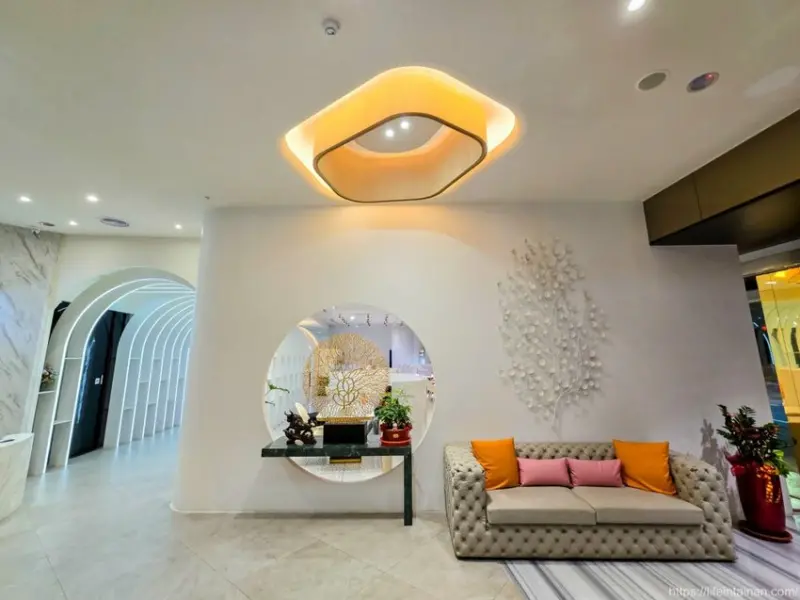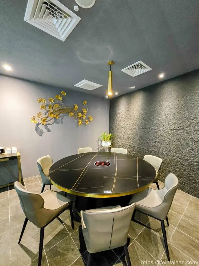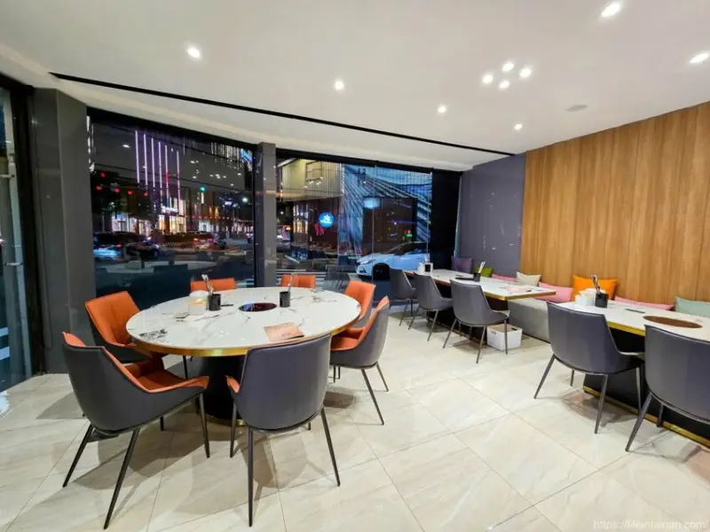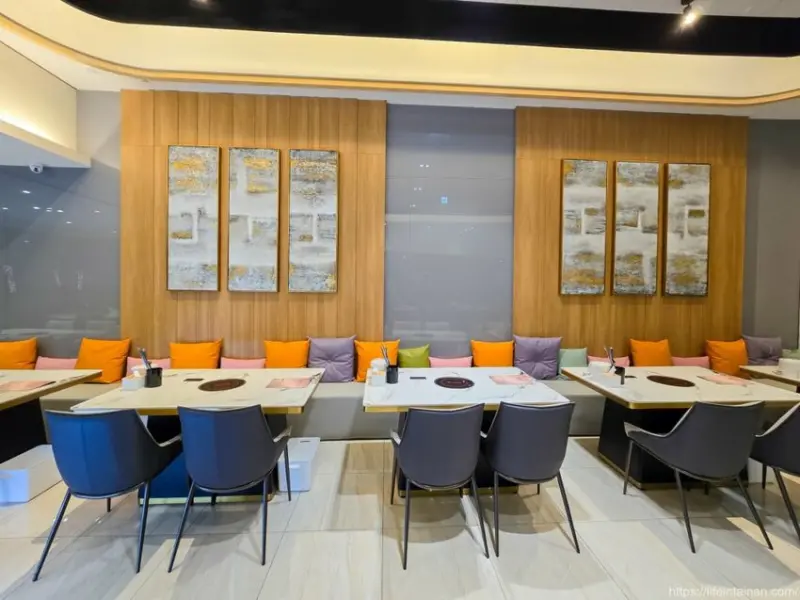用餐空間很大,四人、六人、圓桌等,可以依照人數安排不一樣的座位,四人桌一邊是沙發一邊是椅子。另一區有點半包廂空間概念,因為座位間隔很開,光線明亮、環境乾淨,還有很多人來吃鍋都會拍的白色長廊。
