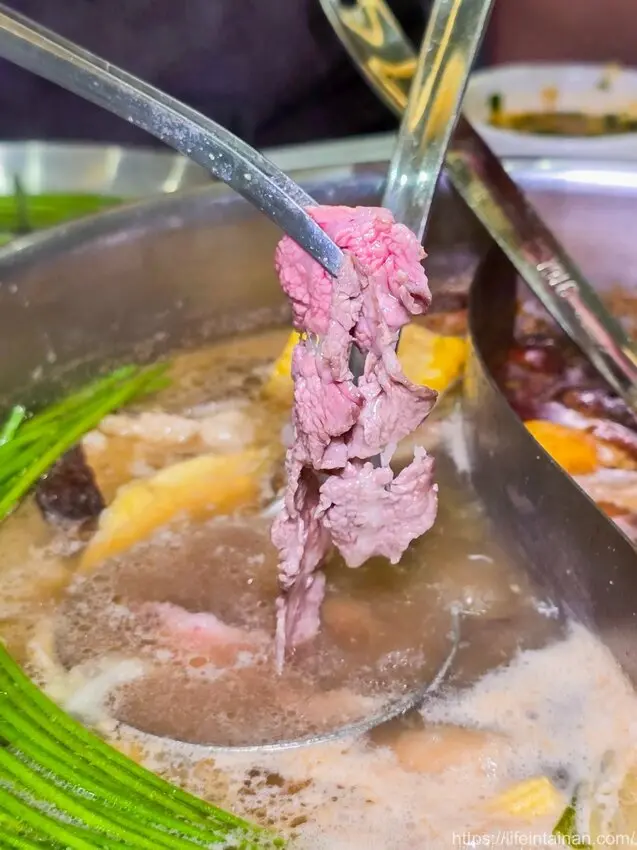 台南溫體牛肉切盤,這盤是2份的量,吃肉就是要爽爽吃。牛五花的部位油脂較多,而這盤頂級牛肉使用老饕肉、肋眼蓋肉、菲力肉等,會依配送的部位為主,每天限量。夾起溫體肉涮個3~4秒呈現粉紅色就好吃,也可以直接把肉放在碗內,直接將滾的牛肉湯淋上去。