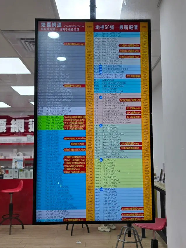 地標網通門市前有這個地標50強排行榜,此排行是根據地標網通全台超過45間門市的銷量和人氣搜尋等統計的喔,可點我查看熱銷手機排行榜。