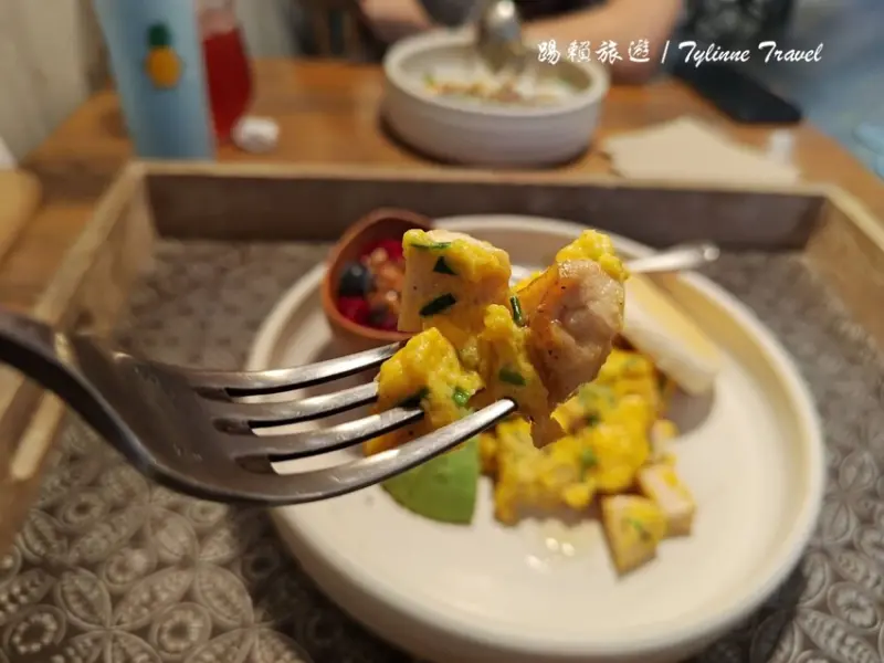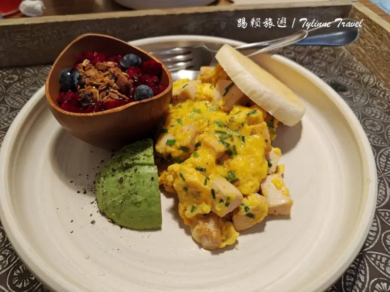 附贈的「水果優格杯」超加分,裡面有當季水果(像紅色火龍果)、甜穀物、奇亞籽、蜂蜜和優格,每一口都飽滿又清爽,甜點和主餐一次搞定!